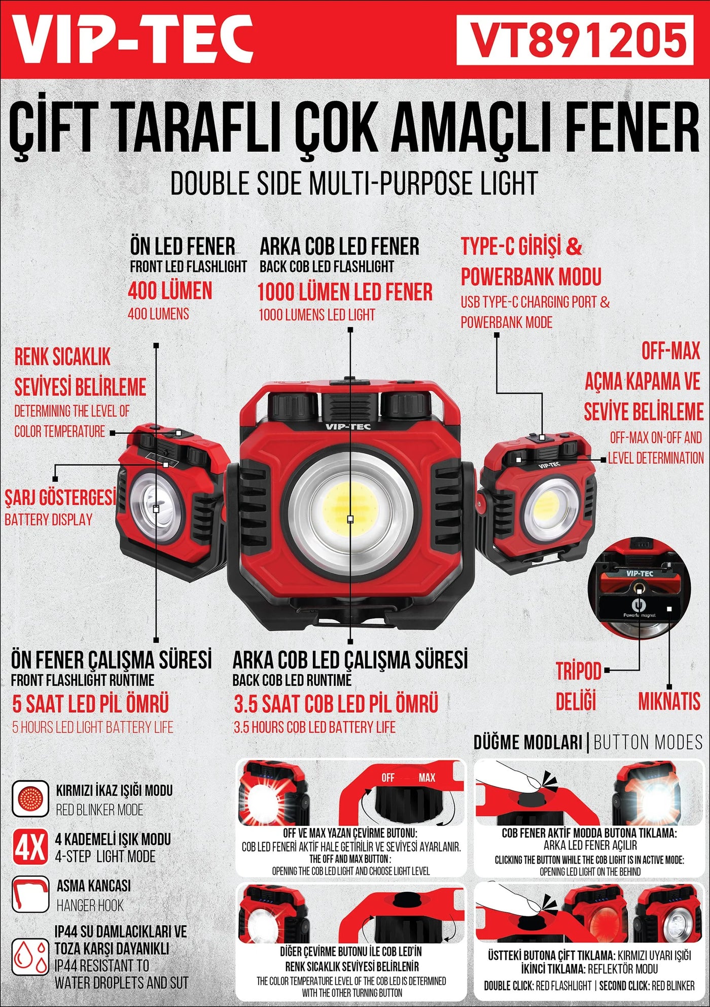VT891205 DualBeam Pro — Çift Taraflı Şarj Edilebilir 1000 Lümen Çok Amaçlı Fener